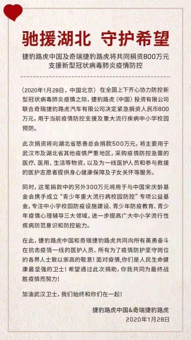 ●東風小康汽車有限公司決定通過重慶市慈善總會,向湖北省慈善總會捐贈東風風光580、東風風光ix7等車輛,共計價值約500萬元,持續助力抗擊新型冠狀病毒肺炎疫情。主要用于十堰市抗擊新型冠狀病毒肺炎的物資運輸、醫護人員接送等。