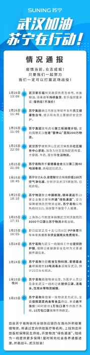 1月25日,蘇寧宣布聯合A.O.史密斯聯合捐贈價值100萬消毒空氣凈化器,分別涉及武漢九家重點醫院。同時,蘇寧物流為援建火神山醫院,迅速開展搶送保障物資服務。
