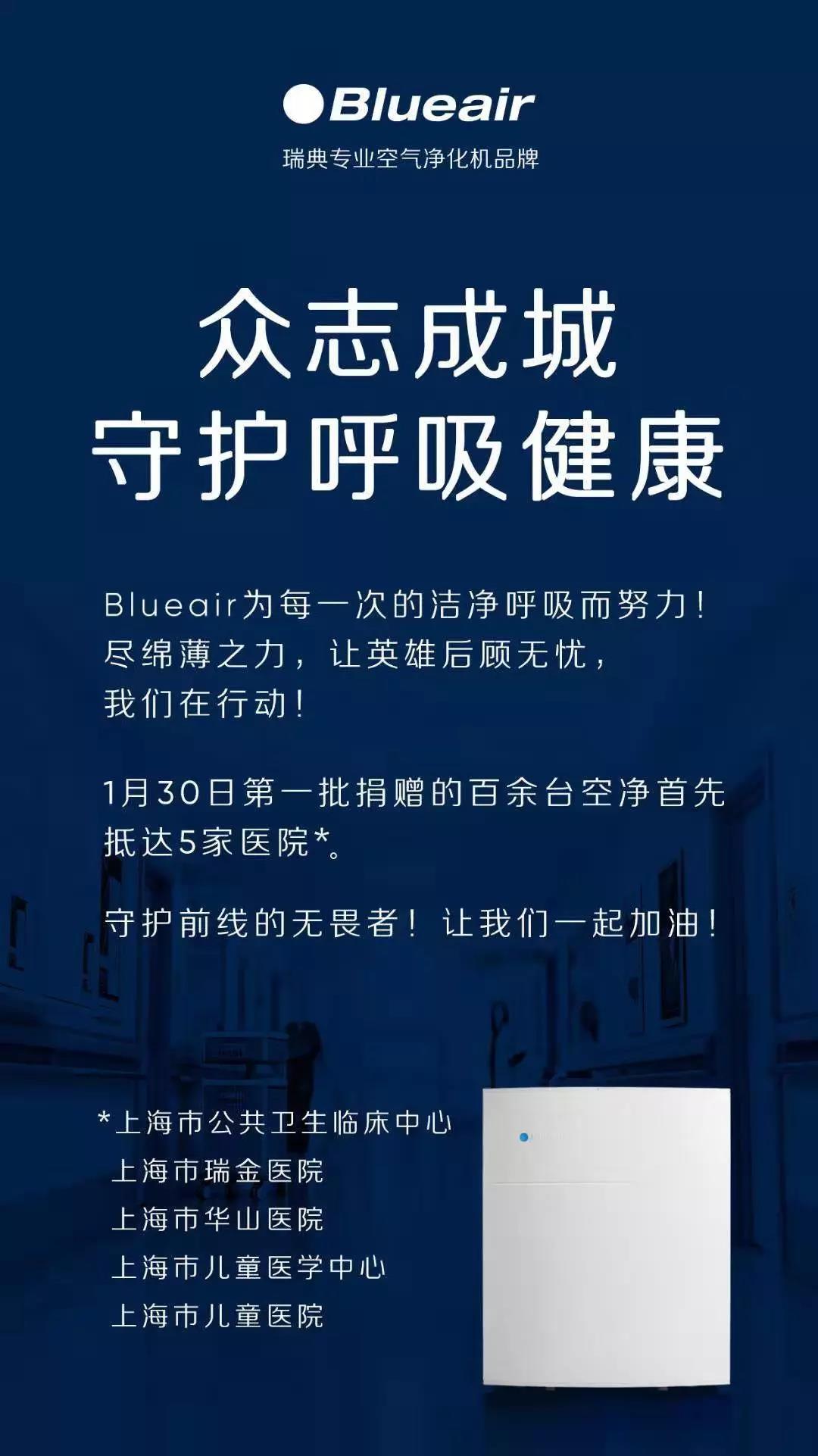 1月30日,聯合利華旗下空氣凈化器品牌布魯雅爾向上海定點收治醫院金山公共衛生臨床中心及其他4家醫院緊急支援了百余臺專業空氣凈化器,盡力為醫生和患者創造安全、健康的室內呼吸環境。