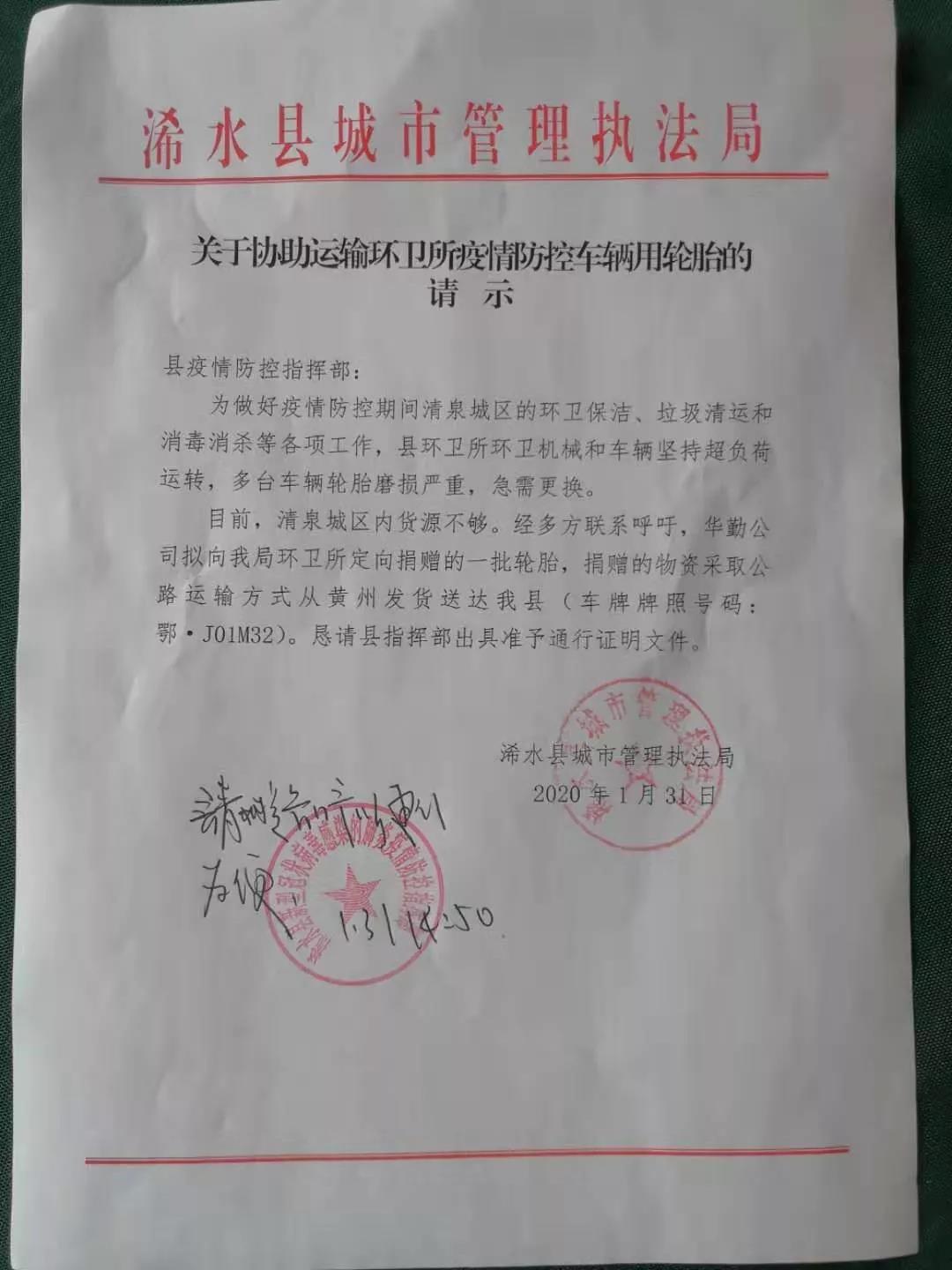 1月31日,為做好疫情防控期間的環衛保潔、垃圾清運和消毒殺毒等各項工作,黃岡市浠水縣環衛所環衛機械和車輛堅持超負荷運轉,多臺車輛輪胎磨損嚴重急需更換。通力輪胎有限公司接到此消息后高度重視,迅速與湖北省黃岡市浠水慈善會取得聯系,向浠水縣慈善協會捐贈了一批輪胎,該物資主要用于黃岡市浠水縣環境衛生管理所城市環境衛生防疫消毒車輛,為前線提供堅實的保障!