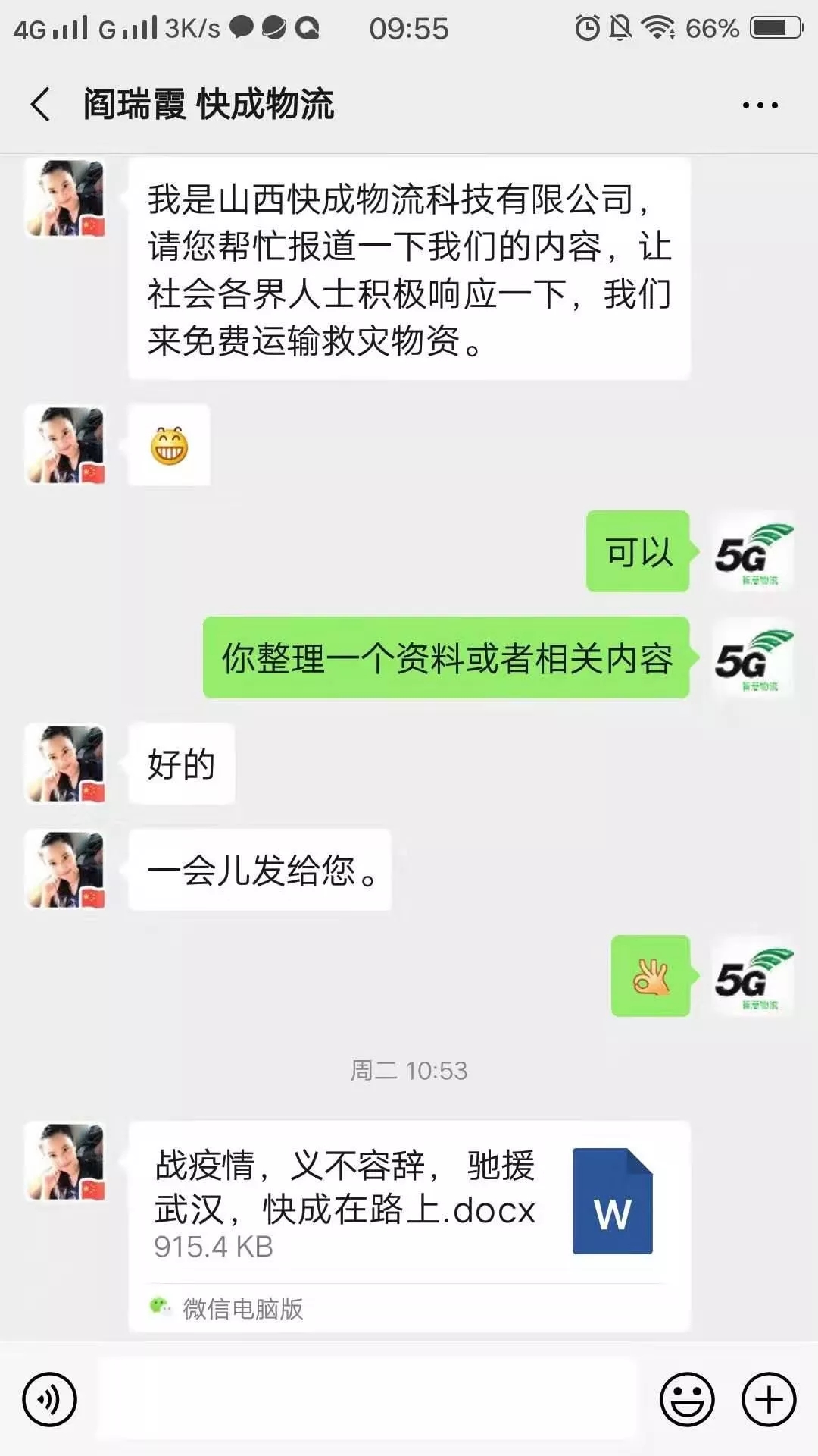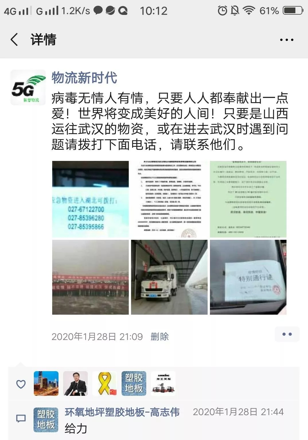 1月28日9:55山西快成物流有限公司閻瑞霞女士發來信息。“為了響應黨和政府號召,我們快成物流公司成立了60位司機和30輛半掛車的應急小組。為山西到武漢的救援物資提供全程免費運輸服務。”一個愛心運輸應急小組發出了物流人的心聲,體現了社會責任和實力擔當。