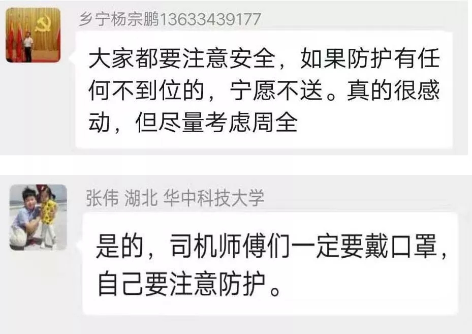 微信群里緊張的氣氛一下子緩和了好多,兩位司機師傅的防護問題終于解決了。接下來就是群里對司機師傅的一番囑咐,“兩位師傅一定要自覺做好防護工作!我們為你們的行為感動!同時,你們要讓家人放心,為自己做好防護措施。”“口罩、防護服和消毒液就是你們的守護神啊!”