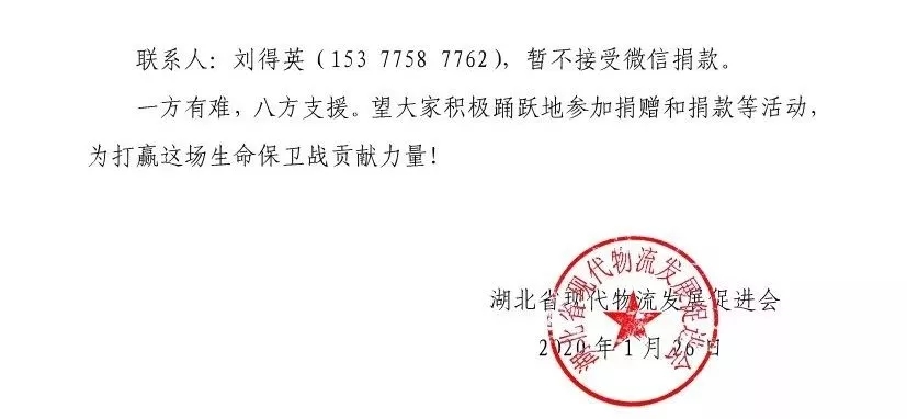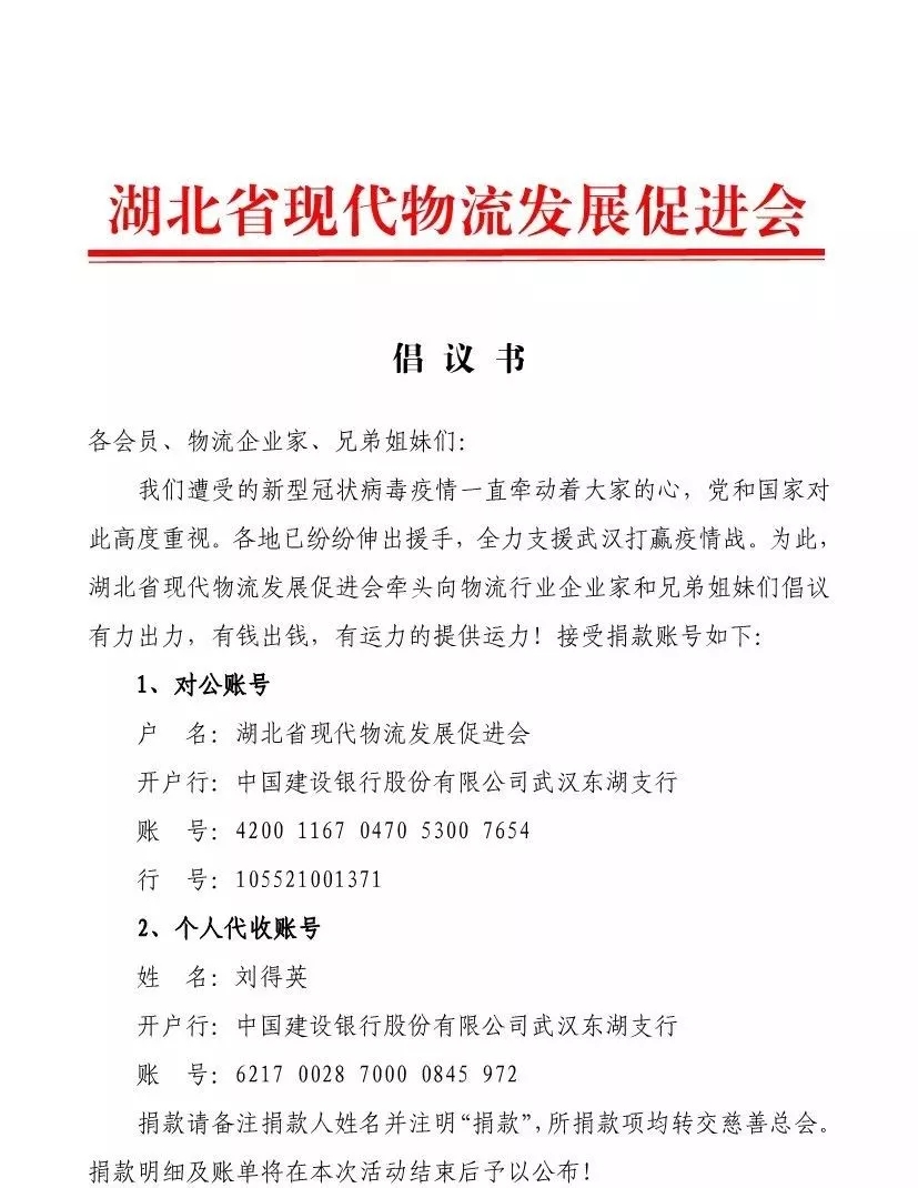 自新型冠狀病毒感染的肺炎疫情發生以來,省物流促進會積極響應黨中央、國務院全面抗擊疫情的號召,第一時間動員和聯系廣大會員企業向武漢、黃石、黃岡、宜昌等全省各地市區運輸和調配抗擊疫情所需物資,1月26日,我會報相關部門同意發起抗擊新型冠狀病毒疫情募捐倡議: