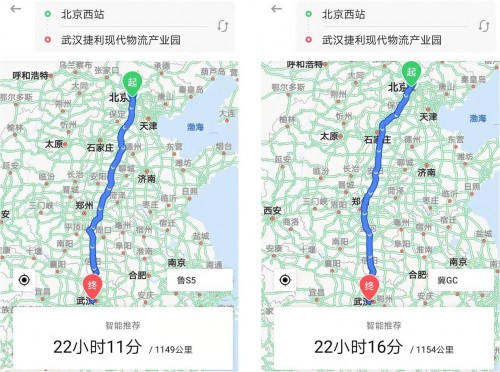 以魯S5XXXX和冀GCXXXX兩輛貨車為例,同樣是從北京西站出發,前往進鄂應急物資中轉調運站之一的武漢市東西湖區捷利物流園,車旺大卡就根據車型不同,給兩輛車推薦了不同的行駛路線。