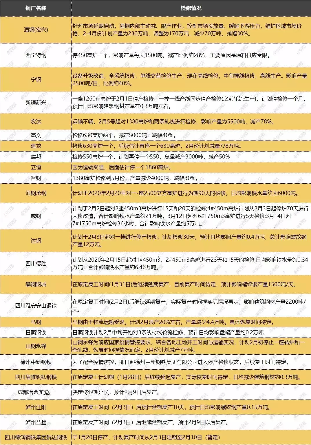 疫情對(duì)鋼鐵生產(chǎn)企業(yè)排產(chǎn)形成較大擾動(dòng),由于需求下降、運(yùn)輸緊張以及員工安全等因素,部分鋼廠成品材庫(kù)存大幅累積,同時(shí)原材料庫(kù)存?zhèn)湄洸蛔悖瑢?dǎo)致開(kāi)始被動(dòng)減產(chǎn)。長(zhǎng)流程鋼廠方面,春節(jié)期間多數(shù)鋼企生產(chǎn)基本正常,節(jié)后唐山、山東、安徽部分長(zhǎng)流程鋼廠相繼宣布限產(chǎn)20%-25%。西部地區(qū)前期剛完成檢修的生產(chǎn)線由于安全因素,計(jì)劃延遲恢復(fù)生產(chǎn)。鞍鋼、馬鋼等部分計(jì)劃2月份檢修的鋼廠則因?yàn)榘踩蛩兀笸七t生產(chǎn)線檢修。