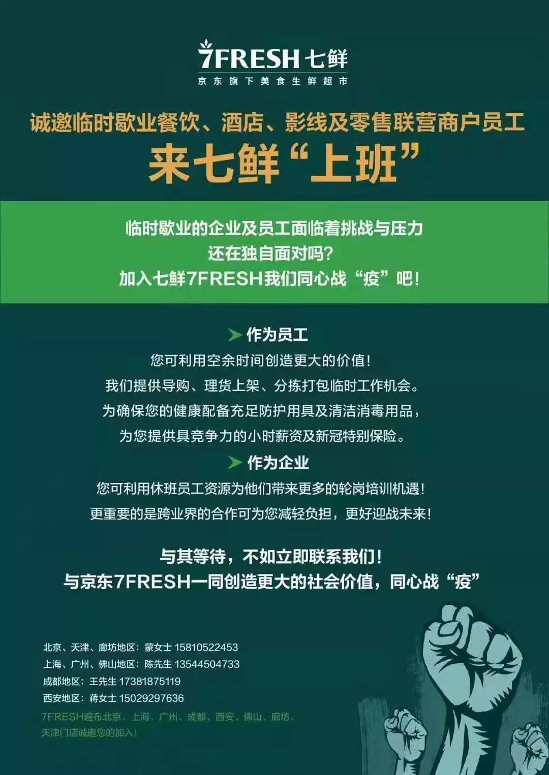 2月5日,為了在特殊時期促進就業(yè),京東7FRESH發(fā)布了“人才共享”計劃,面向全國招募臨時員工,誠邀臨時歇業(yè)的員工在此期間以短期打工的方式加盟。目前,大洋世家等多家餐飲企業(yè)員工開始到京東七鮮超市上班。