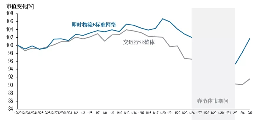 交運行業(yè)疫情期間的市值變化情況 (2019.12.20-2020.2.5) [以100為基準數(shù),包括A股及美股上市的中國交運物流企業(yè),美股中包括美團、BEST和ZTO]
