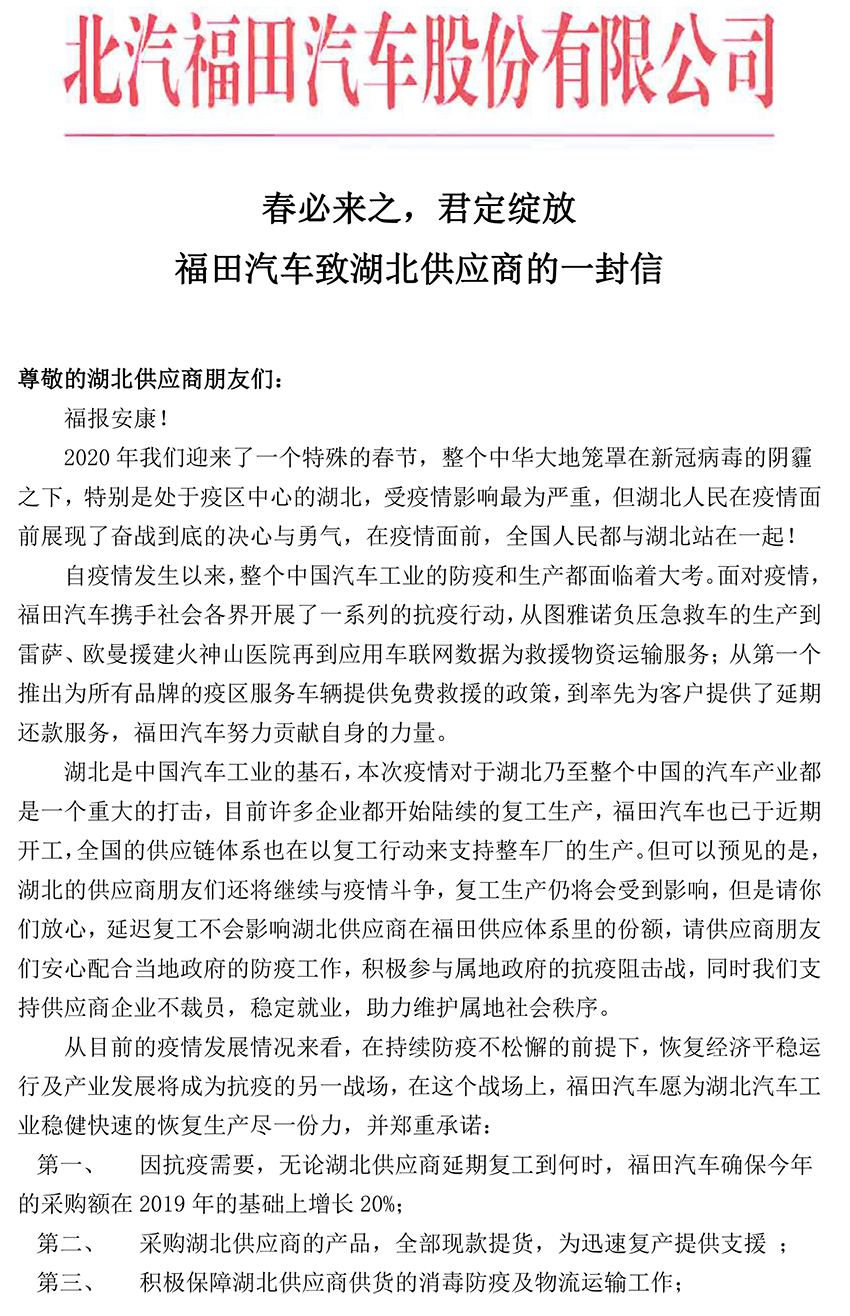 春必來之,君定綻放——福田汽車致湖北供應商的一封信