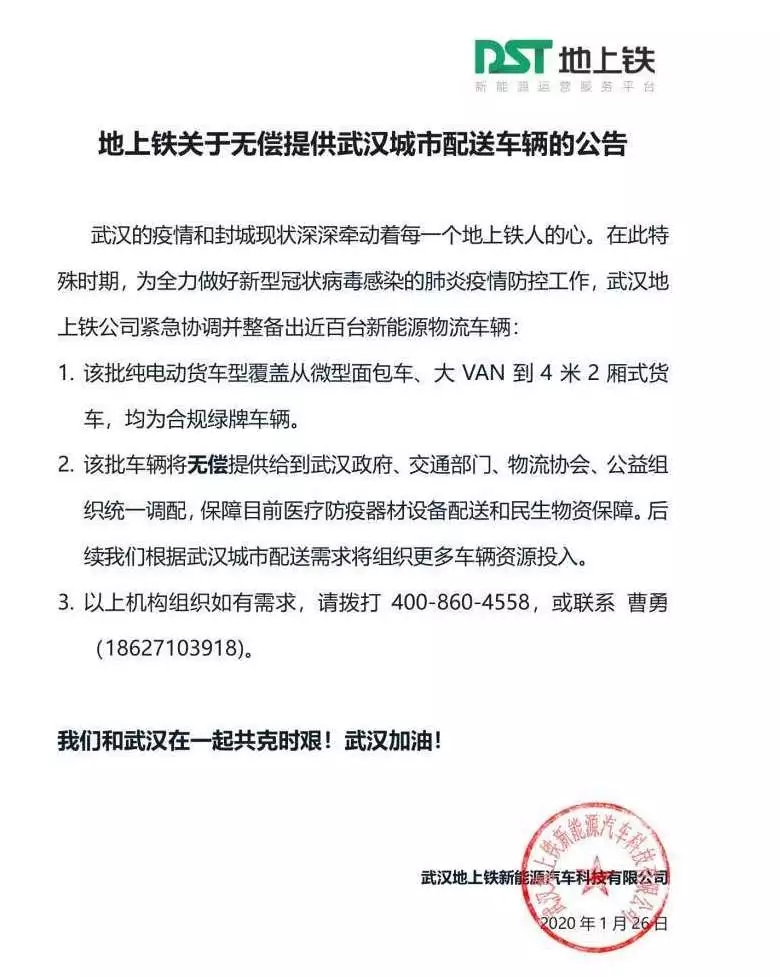 緊急協(xié)調(diào)并整備出近百臺純電動物流車,向武漢市政府、協(xié)會、公益機構(gòu)發(fā)出免費用車服務(wù)公告,全力支持疫情防控物資配送工作。
