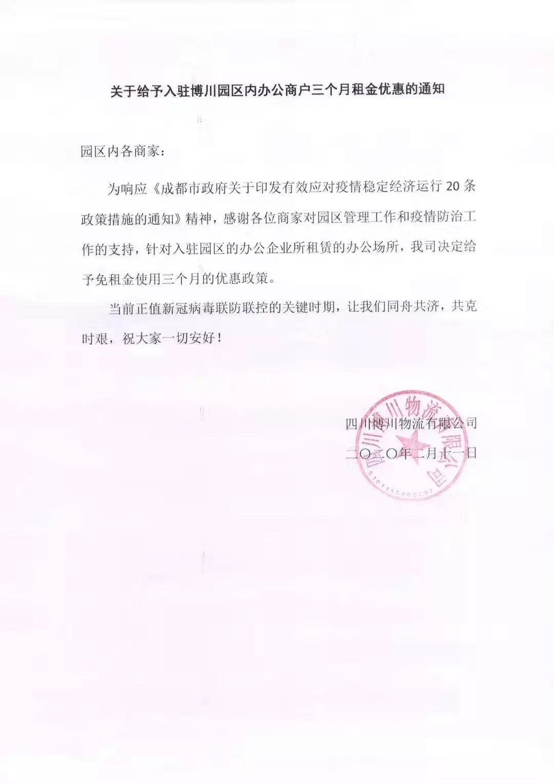 2月11日,為感謝各商家對園區管理工作和疫情防治工作的支持,中金協鋼鐵產業互聯網專委會骨干企業四川博川物流有限公司發布《關于給予入住博川園區內辦公商戶三個月租金優惠的通知》。針對入駐園區的辦公企業所租賃的辦公場所,給予免租金使用三個月的優惠政策,