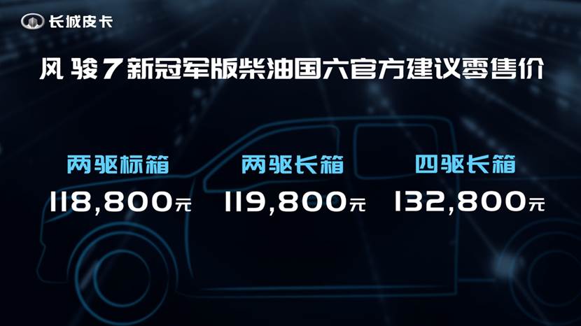 風駿旗下另一款重磅車型——風駿7新冠軍版同步上市。風駿7新冠軍版是為紀念長城皮卡連續22年銷量冠軍打造而來,是長城皮卡的高端精品車型,冠軍版座椅、后貨箱均帶有“冠軍版”標識,打造專屬感。同時,新車在外觀、內飾以及配置等方面均做了全面提升,比如換裝固鉑輪胎、加裝外后視鏡除霜等。