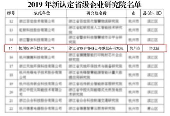 ▲2019年省級企業研究院名單,"浙江省朗和容器云與微服務研究院"名列其中