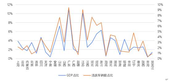 貨運活動是經濟發展走勢的“晴雨表”。報告顯示,2019年貨運活躍運力與GDP相關系數達0.81,而活躍車輛數與GDP相關系數達0.86。二者之間存在較強正相關,多數省份呈現出了“經濟活動水平越高,活躍運力水平越高”的情況,兩者趨勢具有總體一致性。