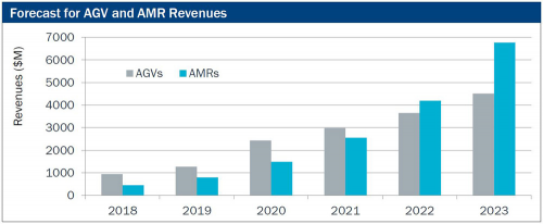 于是,可顯著提升搬運(yùn)效率同時(shí)降低人工成本的機(jī)器人迅速發(fā)展,其中又以AMR自主移動機(jī)器人的智能度最高、最具柔性能力,成為了人工智能在產(chǎn)業(yè)垂直落地的風(fēng)口。據(jù)Interact Analysis數(shù)據(jù),2023年全球AMR市場將爆發(fā)至70億美元。