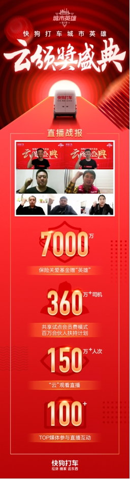 快狗打車總裁何松、9位城市英雄、百余家頭部媒體以及百余萬直播間的觀眾參與了本次盛典,盛典總觀看人次超過150萬,他們共同見證了城市英雄的高光時刻。