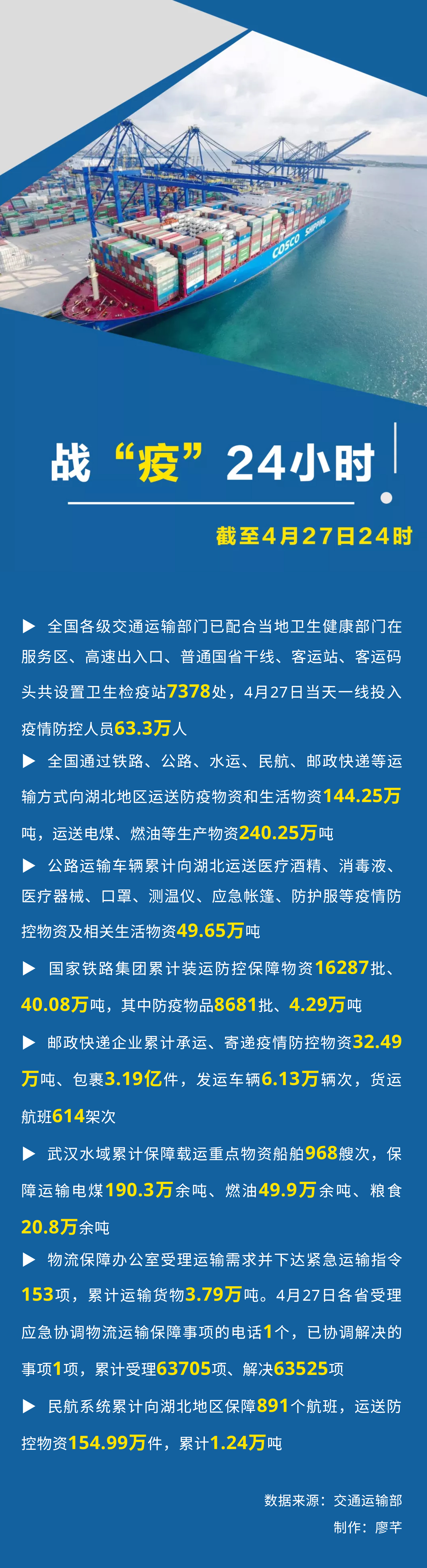 戰疫24小時 | 累計向湖北地區運送防疫和生活物資144.25萬噸