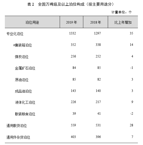 全國萬噸級及以上泊位中,專業(yè)化泊位1332個,比上年增加35個;通用散貨泊位559個,增加28個;通用件雜貨泊位403個,增加7個。