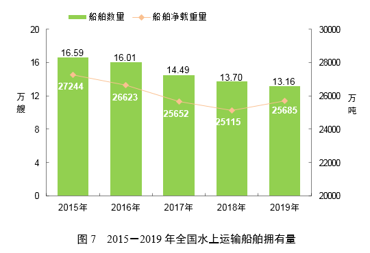 年末全國擁有水上運輸船舶13.16萬艘,比上年下降4.0%;凈載重量25684.97萬噸,增長2.3%;載客量88.58萬客位,下降8.0%;集裝箱箱位223.85萬標準箱,增長13.8%。