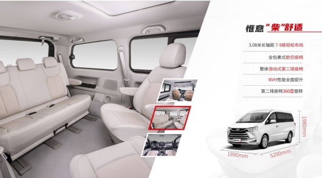 在5200*1890*1980mm車身尺寸和3080mm的軸距下,是全新一代瑞風M4柴油版的7-9座靈活座椅布局、全包裹式航空座椅、第二排座椅3600旋轉、整體滑動式第三排座椅、NVH全面提升等帶來的舒適乘坐享受。