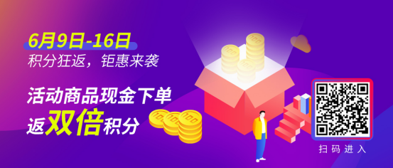6月9日-16日,積分狂返,鉅惠來襲,現金商品下單返雙倍積分,買多少返多少,不限量。