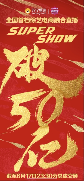 6月17日23點40分,蘇寧易購618超級秀發布即時戰報:綜藝晚會、明星直播發揮疊加效應,截至23點30分,成交額突破50億。