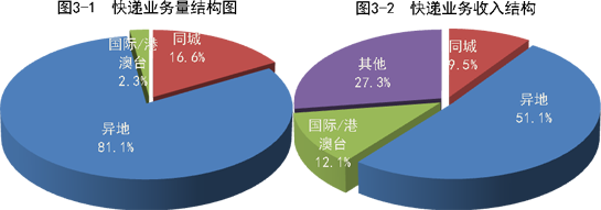 上半年,同城、異地、國(guó)際/港澳臺(tái)快遞業(yè)務(wù)量分別占全部快遞業(yè)務(wù)量的16.6%、81.1%和2.3%;業(yè)務(wù)收入分別占全部快遞收入的9.5%、51.1%和12.1%。與去年同期相比,同城快遞業(yè)務(wù)量的比重下降1.7個(gè)百分點(diǎn),異地快遞業(yè)務(wù)量的比重上升1.7個(gè)百分點(diǎn),國(guó)際/港澳臺(tái)業(yè)務(wù)量比重基本持平。