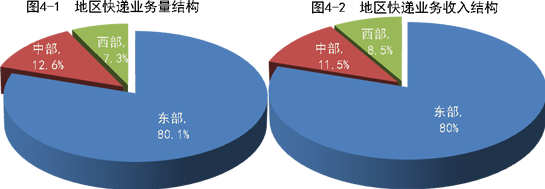 上半年,東、中、西部地區(qū)快遞業(yè)務(wù)量比重分別為80.1%、12.6%和7.3%,業(yè)務(wù)收入比重分別為80%、11.5%和8.5%。與去年同期相比,東、中、西部地區(qū)快遞業(yè)務(wù)量比重基本持平,東部地區(qū)快遞業(yè)務(wù)收入比重下降0.5個(gè)百分點(diǎn);中部地區(qū)快遞業(yè)務(wù)收入比重上升0.4個(gè)百分點(diǎn);西部地區(qū)快遞業(yè)務(wù)收入比重上升0.1個(gè)百分點(diǎn)。