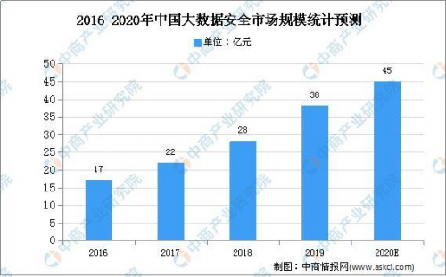 數據顯示,2019年我國大數據安全市場規模近40億元,2016年到2019年復合增長率為30.8%。中商產業研究院預測2020年中國大數據安全市場規模將達45億元。