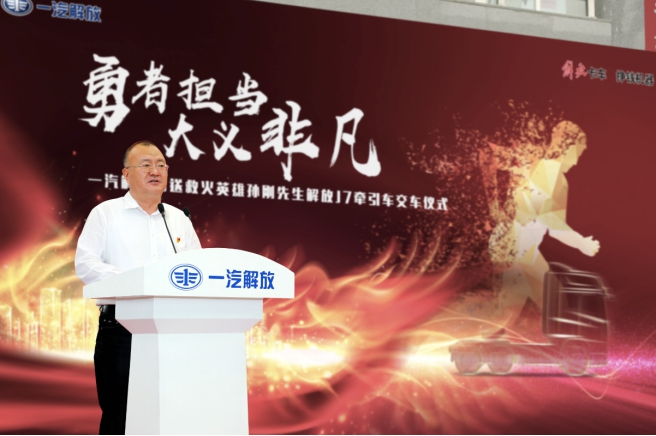 7月31日,以“勇者擔當·大義非凡”為主題的一汽解放贈送孫剛先生解放J7牽引車儀式在吉林長春隆重舉行,中國一汽總經理助理、一汽解放董事長、黨委書記胡漢杰,一汽解放總經理、黨委副書記朱啟昕,一汽解放黨委副書記、工會主席張國華,一汽解放總經理助理、銷售公司總經理、黨委書記王志才,一汽解放銷售公司副總經理張松,一汽解放黨群工作部部長任瑞杰等領導,以及救火英雄孫剛先生、新聞媒體記者朋友們參加了此次活動,共同見證了這一榮耀的時刻。