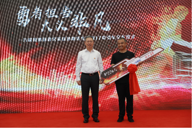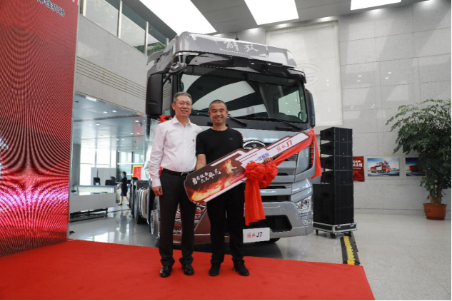 (中國一汽總經理助理、一汽解放董事長、黨委書記胡漢杰為英雄贈送J7鑰匙)