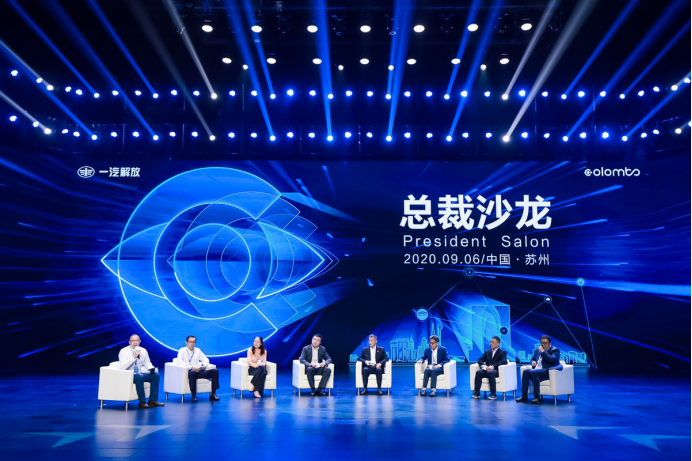 一汽解放第二屆生態合作伙伴大會總裁沙龍現場(從左至右依次為:主持人 運聯智庫總裁王陽,隱山資本管理合伙人董中浪,眾安保險副總經理吳煥晨,京東集團自動駕駛首席科學家、智能駕駛總經理孔旗,一汽解放副總經理、商用車開發院院長吳碧磊,經緯恒潤集團董事兼CEO吉英存,智加科技工程高級副總裁、中國區總經理容力,四維圖新高級副總裁&中寰衛星總經理梁永杰)