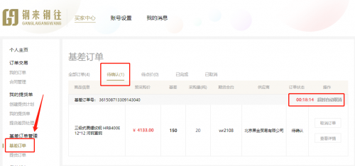 確認(rèn)基差訂單:等待賣家確認(rèn)基差訂單,確認(rèn)時(shí)限為20分鐘,超時(shí)將自動(dòng)取消;