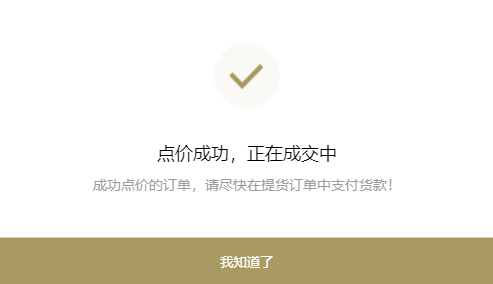 確認(rèn)點(diǎn)價(jià):買(mǎi)家點(diǎn)價(jià)后,等待賣家確認(rèn),若賣家取消點(diǎn)價(jià)或超時(shí)確認(rèn)(買(mǎi)家點(diǎn)價(jià)當(dāng)日下午五點(diǎn)后還未操作即為超時(shí)),點(diǎn)價(jià)失敗,買(mǎi)家可重新申請(qǐng)點(diǎn)價(jià),若點(diǎn)價(jià)成功,生成提貨單;