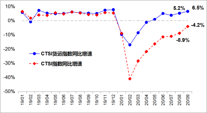 2020年9月,中國運輸生產指數(CTSI)為168.4點,同比下降4.2%,降幅較8月收窄4.7個百分點。分結構看,CTSI貨運指數為192.7點,同比增長6.5%,增速較8月加快1.3個百分點;CTSI客運指數為124.1點,同比下降25.4%,降幅較8月收窄10.5個百分點。