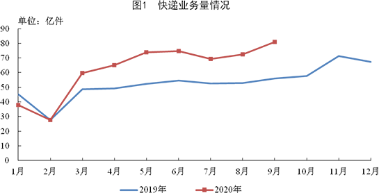 9月份,全國快遞服務企業(yè)業(yè)務量完成80.9億件,同比增長44.6%;業(yè)務收入完成824.3億元,同比增長27%。