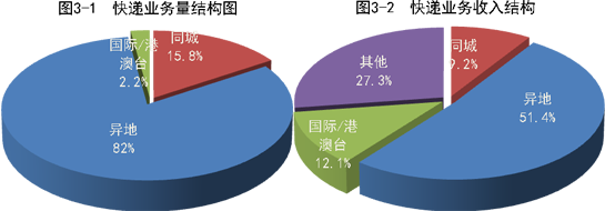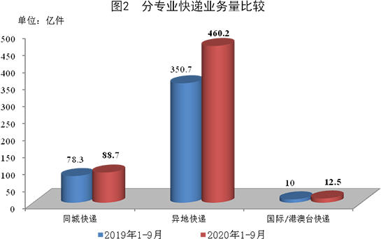 1-9月,同城、異地、國際/港澳臺快遞業(yè)務量分別占全部快遞業(yè)務量的15.8%、82%和2.2%;業(yè)務收入分別占全部快遞收入的9.2%、51.4%和12.1%。與去年同期相比,同城快遞業(yè)務量的比重下降2個百分點,異地快遞業(yè)務量的比重上升2.1個百分點,國際/港澳臺業(yè)務量比重下降0.1個百分點。