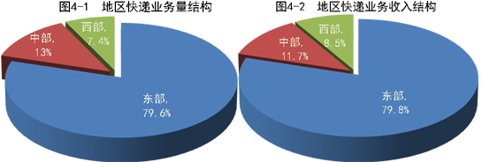 1-9月,東、中、西部地區(qū)快遞業(yè)務量比重分別為79.6%、13%和7.4%,業(yè)務收入比重分別為79.8%、11.7%和8.5%。與去年同期相比,東部地區(qū)快遞業(yè)務量比重下降0.3個百分點,快遞業(yè)務收入比重下降0.6個百分點;中部地區(qū)快遞業(yè)務量比重上升0.4個百分點,快遞業(yè)務收入比重上升0.6個百分點;西部地區(qū)快遞業(yè)務量比重下降0.1個百分點,快遞業(yè)務收入比重基本持平。