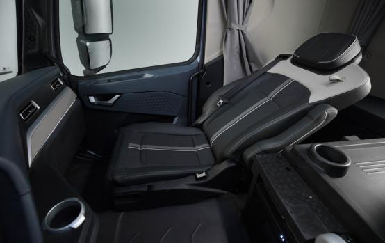 駕駛室采用大客廳式設計,空間大、視野開闊、乘坐舒適。轎車化的內飾,兼具時尚感和科技感。主駕采用頭枕一體式豪華空氣座椅,夏天通風,不擔心悶汗,冬季加熱,不懼嚴寒。腰部設有氣囊支撐,可根據需要進行硬度調節。副駕座椅配備腰部、背部按摩功能,可全方位進行電動調節。收起臥鋪后,座椅靠背可放倒,搭配上電動腿托,瞬間享受到如飛機頭等艙般的駕乘體驗。