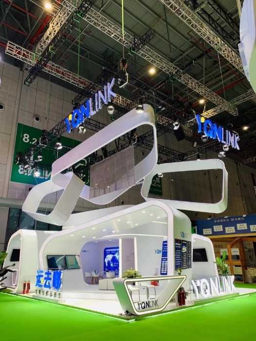 最后登場(chǎng)的,就是咱們“運(yùn)去哪”(英文名:YQNLINK)展臺(tái)了!整體造型猶如一艘沖上云霄、飛往未來(lái)的航運(yùn)飛船,在星辰大海中自由翱翔,科技感、未來(lái)感十足,與“運(yùn)去哪”航運(yùn)數(shù)字化創(chuàng)新者的品牌形象完美契合。