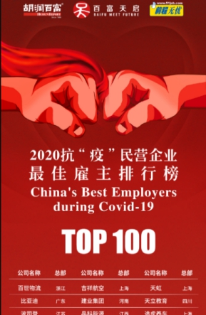 近日,胡潤百富發布了《2020抗“疫”民營企業最佳雇主排行榜》,表彰民營企業應對疫情挑戰的杰出雇主標桿,百世集團入榜2020抗“疫”民營企業最佳雇主TOP100。該榜單篩選在疫情面前快速反應、積極利用人力資源手段維持企業正常運行,同時最大限度保障員工利益、安全和滿意度,并全面承擔社會責任的民營企業。