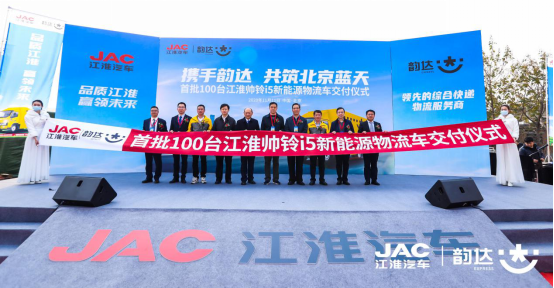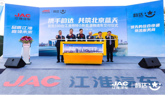 2020年11月11日,值此雙十一,在首都北京,江淮汽車(chē)與韻達(dá)快遞首批100臺(tái)新能源商用車(chē)帥鈴i5交付儀式圓滿完成。北京市郵政管理局局長(zhǎng)王躍、副局長(zhǎng)韓敬華、安徽省郵政管理局局長(zhǎng)李勇、安徽省郵政協(xié)會(huì)副會(huì)長(zhǎng)羅俊、韻達(dá)快遞副總經(jīng)理鄭金弟、韻達(dá)快遞總經(jīng)理助理劉勇軍、安徽江淮汽車(chē)集團(tuán)股份有限公司總經(jīng)理項(xiàng)興初、安徽江淮汽車(chē)集團(tuán)股份有限公司副總經(jīng)濟(jì)師兼輕型商用車(chē)營(yíng)銷(xiāo)公司總經(jīng)理張先華、安徽江淮汽車(chē)集團(tuán)股份有限公司副總經(jīng)濟(jì)師兼總經(jīng)理辦公室主任張義魁、安徽江淮汽車(chē)集團(tuán)股份有限公司重型商用車(chē)公司副總經(jīng)理戚軍、安徽江淮汽車(chē)集團(tuán)股份有限公司新能源商用車(chē)公司總經(jīng)理助理徐彥峰、安徽江淮汽車(chē)集團(tuán)股份有限公司商務(wù)車(chē)公司總經(jīng)理助理張中及北京區(qū)域十余家快遞企業(yè)代表出席儀式,共同見(jiàn)證車(chē)輛交付。