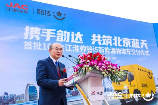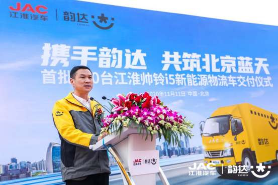 安徽江淮汽車(chē)集團(tuán)股份有限公司總經(jīng)理項(xiàng)興初代表江淮汽車(chē)致辭。他表示,近兩年,綠色物流得到快速發(fā)展,早在2018年,中國(guó)郵政就啟動(dòng)了“綠色郵政建設(shè)行動(dòng)三年行動(dòng)方案”。同年5月,北京郵政即投放了147輛新能源郵政運(yùn)輸車(chē)到城六區(qū)、副中心及機(jī)場(chǎng)和使館區(qū)域使用,進(jìn)一步助力物流配送升級(jí),培育城市配送綠色生態(tài)系統(tǒng)。多年來(lái),北京市政府在節(jié)能環(huán)保上堅(jiān)定不移,積極制定各項(xiàng)舉措,為全國(guó)各省市做出表率,充分展現(xiàn)首都示范作用。江淮汽車(chē)早在2002年即開(kāi)啟新能源汽車(chē)研發(fā),在新能源汽車(chē)領(lǐng)域深耕多年,已建立國(guó)際先進(jìn)、國(guó)內(nèi)領(lǐng)先的技術(shù)平臺(tái)。目前江淮汽車(chē)在北京已有近1萬(wàn)輛新能源乘用車(chē)和近千輛新能源商用車(chē)投入市場(chǎng)終端運(yùn)營(yíng),為北京環(huán)境保護(hù)事業(yè)持續(xù)貢獻(xiàn)綿薄之力。江淮新能源商用車(chē)致力于打造中國(guó)新能源商用車(chē)領(lǐng)軍品牌,通過(guò)迭代研發(fā)和平臺(tái)移植,現(xiàn)已建立帥鈴i3、i5、i6三大產(chǎn)品平臺(tái),覆蓋微卡、輕卡、皮卡、輕客、環(huán)衛(wèi)等系列車(chē)型。為郵政、快遞、電商、城配等細(xì)分市場(chǎng)用車(chē)場(chǎng)景,提供全生命周期的用車(chē)解決方案。本次與韻達(dá)快遞的攜手,強(qiáng)強(qiáng)聯(lián)合,共創(chuàng)蔚藍(lán)。為共同深度參與綠色智慧物流的發(fā)展構(gòu)建了全新的生態(tài)。韻達(dá)快遞始終堅(jiān)持打造“成為受人尊敬、值得信賴(lài)、服務(wù)更好的一流快遞企業(yè)”,積極響應(yīng)政府號(hào)召,主動(dòng)承擔(dān)企業(yè)社會(huì)責(zé)任,大力推進(jìn)新能源物流車(chē)的應(yīng)用,為節(jié)能環(huán)保做出積極貢獻(xiàn)。江淮汽車(chē)與韻達(dá)快遞的合作,重新定義了新能源物流車(chē)的需求方案,它不僅僅是運(yùn)輸工具的迭代更新,更是嶄新的綠色智慧物流平臺(tái)的創(chuàng)建!