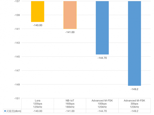 Advanced M-FSK在設計好發射端技術同時,同時通過接收端先進接收機技術,使Advanced M-FSK技術在極低信號具有更好的靈敏度,與其他LPWAN技術相比:相同的速率下,具有更低的靈敏度。在同樣靈敏度下,具有更高的速率。通過內外場測試,100bps的數據速率,靈敏度可以到-144.7dBm。30bps的速率,靈敏度可以到-149.2dBm靈敏度。