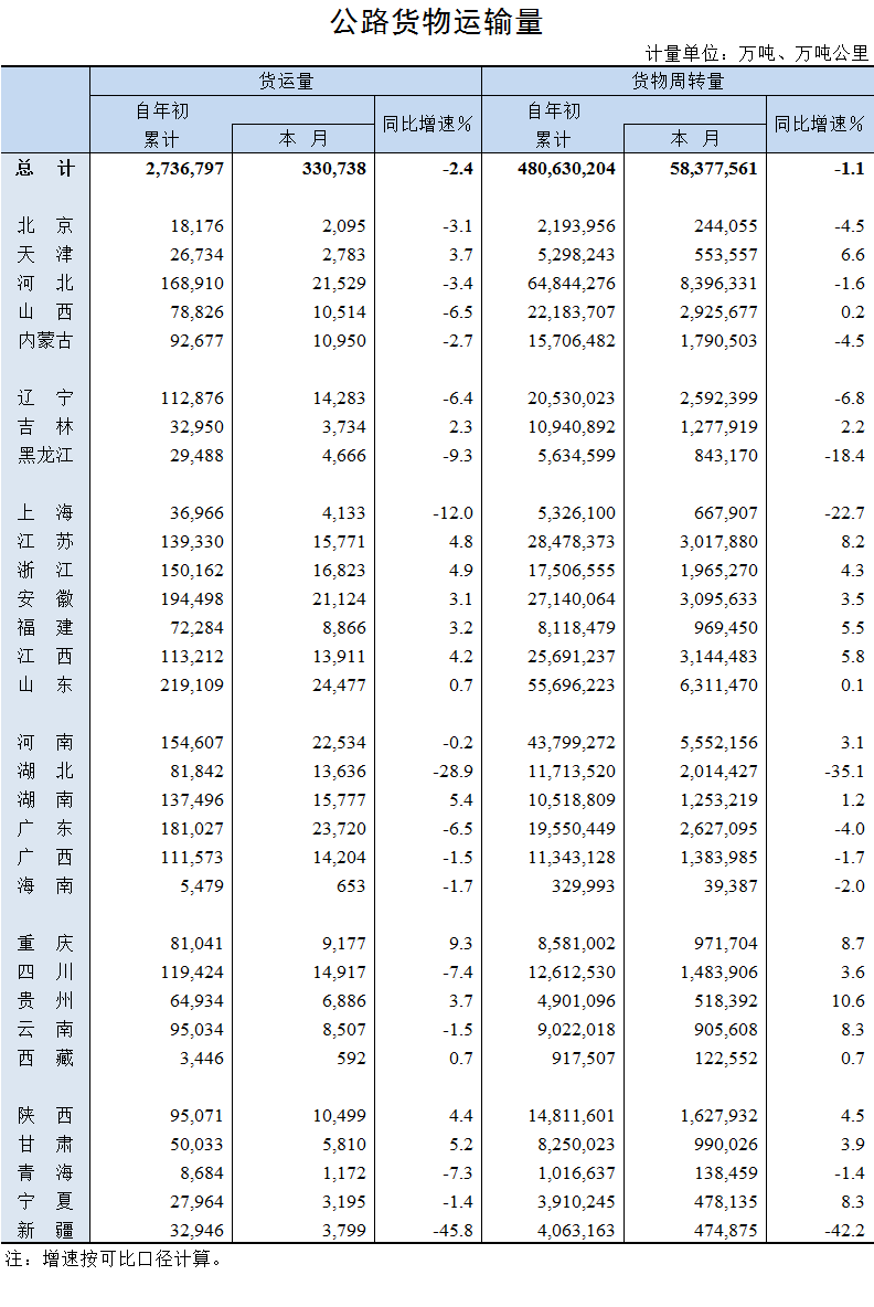 2020年10月公路貨物運輸量