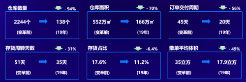 安得一盤貨帶來的價值有多驚人?數(shù)字可以論證。張亞明介紹,“在經(jīng)歷一盤貨物流變革后,美的全國銷售渠道的倉庫數(shù)量從2244個減少到138個,而且138個倉庫的渠道數(shù)據(jù)全部在系統(tǒng)之中;倉庫面積從552萬平米降到了166萬平米;訂單交付周期從45天減到20天,滿足了美的T+3快速交付;庫存周轉(zhuǎn)的天數(shù)從51天降到了35天,這代表著更少占用渠道資金;存貨占比從17.6%下降到11.2%,意味著安得智聯(lián)用更少的渠道庫存支撐了更大的市場銷售規(guī)模;散單平均體積從35立方下降到17.9立方,即從‘大批量少批次’變成了‘小批量多批次’,這也是T+3訂單生產(chǎn)以后帶來的另一效應(yīng)。”