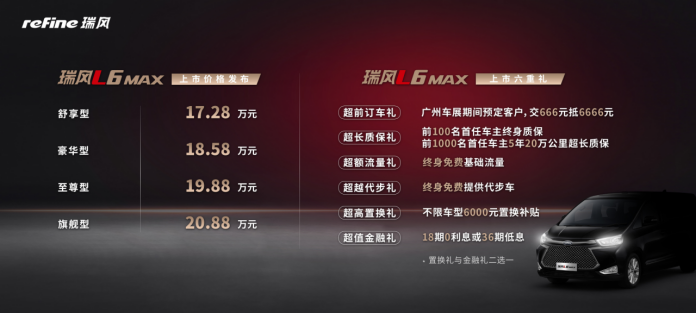 11月20日,“20萬(wàn)級(jí)前驅(qū)超空間商務(wù)MPV”瑞風(fēng)L6 MAX于廣州車展正式上市,定價(jià)17.28萬(wàn)元-20.88萬(wàn)元。作為瑞風(fēng)品牌全新旗艦車型和瑞風(fēng)“L”系列第一款產(chǎn)品,瑞風(fēng)L6 MAX兼具前置前驅(qū)專業(yè)底盤、超大多維空間、20萬(wàn)級(jí)商務(wù)氣質(zhì)三大亮點(diǎn)。面對(duì)不斷商務(wù)化的市場(chǎng)趨勢(shì)和日益精細(xì)化的用戶需求,瑞風(fēng)L6 MAX的入場(chǎng)將帶來“大 有前程”的中高端公商務(wù)出行體驗(yàn),創(chuàng)造出兼具品質(zhì)感和高價(jià)值的出行解決方案。