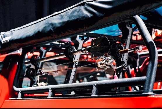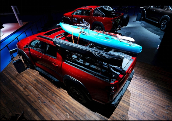 野釣版將貨箱改裝為滑輪抽屜式隔斷儲物倉,可將漁具和魚獲分類放置,告別魚線纏繞和污水橫流的窘境;全覆蓋式龍門架,設置大量拓展固定點,分門別類放置魚竿、鐵鍬等物品;此外,龍門架的框架一直延伸到車頂,像皮劃艇等尺寸較大的戶外裝備可以通過固定組件安置在龍門架上方,想釣魚或者想戲水都可以。