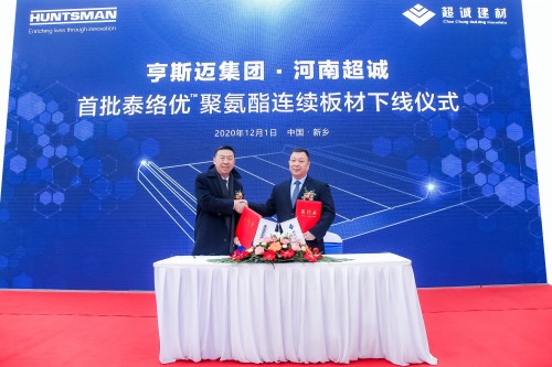 2020年12月01日,河南新鄉——全球領先的特殊化學品企業亨斯邁集團發布升級版四大可持續創新解決方案,將食物供應鏈解決方案作為新的重要發力點。此次,亨斯邁瞄準蓬勃增長的現代農業和物流冷鏈中的倉儲環節,通過提供綠色安全的保溫材料,旨在助力中國解決當前突出的食品安全問題,并推動更快的業務增長。作為此次升級的首個重要舉措,亨斯邁集團與河南超誠建材科技有限公司在新鄉舉辦首批基于泰絡優?聚酯多元醇的聚氨酯連續板材下線儀式,雙方強強聯合,以綠色產品推動下游產業的綠色升級,實現對中國循環經濟的鄭重承諾。