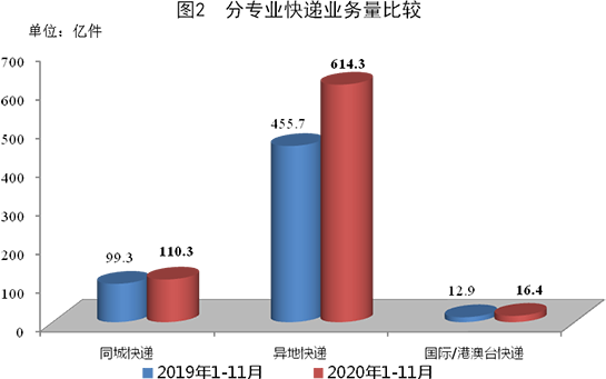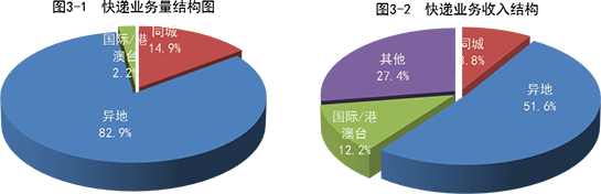 1-11月,同城、異地、國際/港澳臺快遞業務量分別占全部快遞業務量的14.9%、82.9%和2.2%;業務收入分別占全部快遞收入的8.8%、51.6%和12.2%。與去年同期相比,同城快遞業務量的比重下降2.6個百分點,異地快遞業務量的比重上升2.7個百分點,國際/港澳臺業務量比重下降0.1。