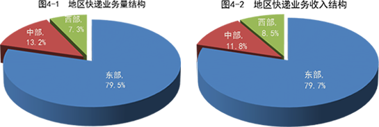 1-11月,東、中、西部地區快遞業務量比重分別為79.5%、13.2%和7.3%,業務收入比重分別為79.7%、11.8%和8.5%。與去年同期相比,東部地區快遞業務量比重下降0.2個百分點,快遞業務收入比重下降0.6個百分點;中部地區快遞業務量比重上升0.4個百分點,快遞業務收入比重上升0.6個百分點;西部地區快遞業務量比重下降0.2個百分點,快遞業務收入比重基本持平。